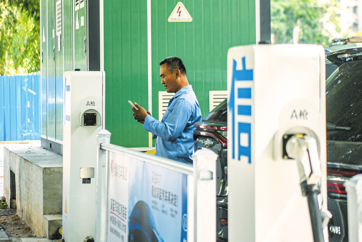 6月1日上午,在美舍嘉苑(一期)正門與美苑路交接處停車場,一名司機在停車場提供的充電樁前掃碼用電。??谌請笥浾?陳長宇 攝